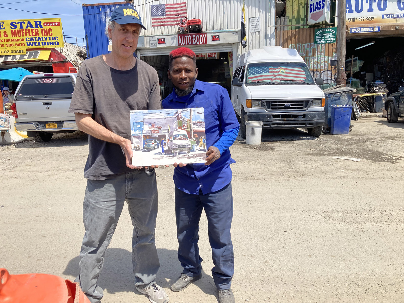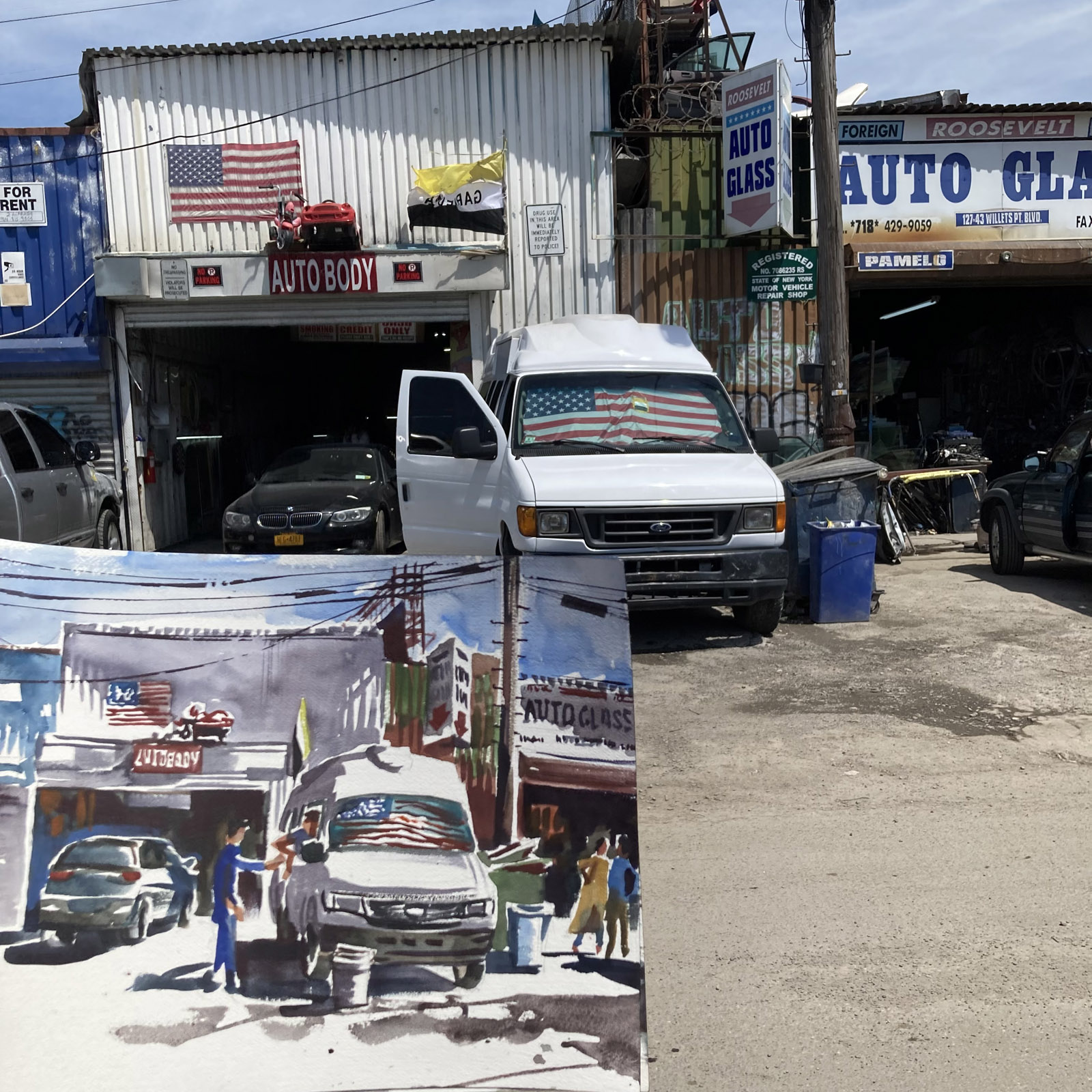 The heart of the project is my experience painting within Willets Point. I enjoy painting in cities and among people. The jumbled, busy, chaotic environment of Willets Point is a particularly exciting subject. Plein air painting is always a way to meet people, who will often approach and see what is being made. The reactions I’ve received from the people working in Willets Point have been especially supportive. People are happy to see their shops in the paintings, and willing to share stories about their businesses and their lives. Quotes from these stories are printed in the book, adding context to the images, and capturing a snapshot in time as this unique New York microcosm vanishes. Here are few of the stories I heard.
