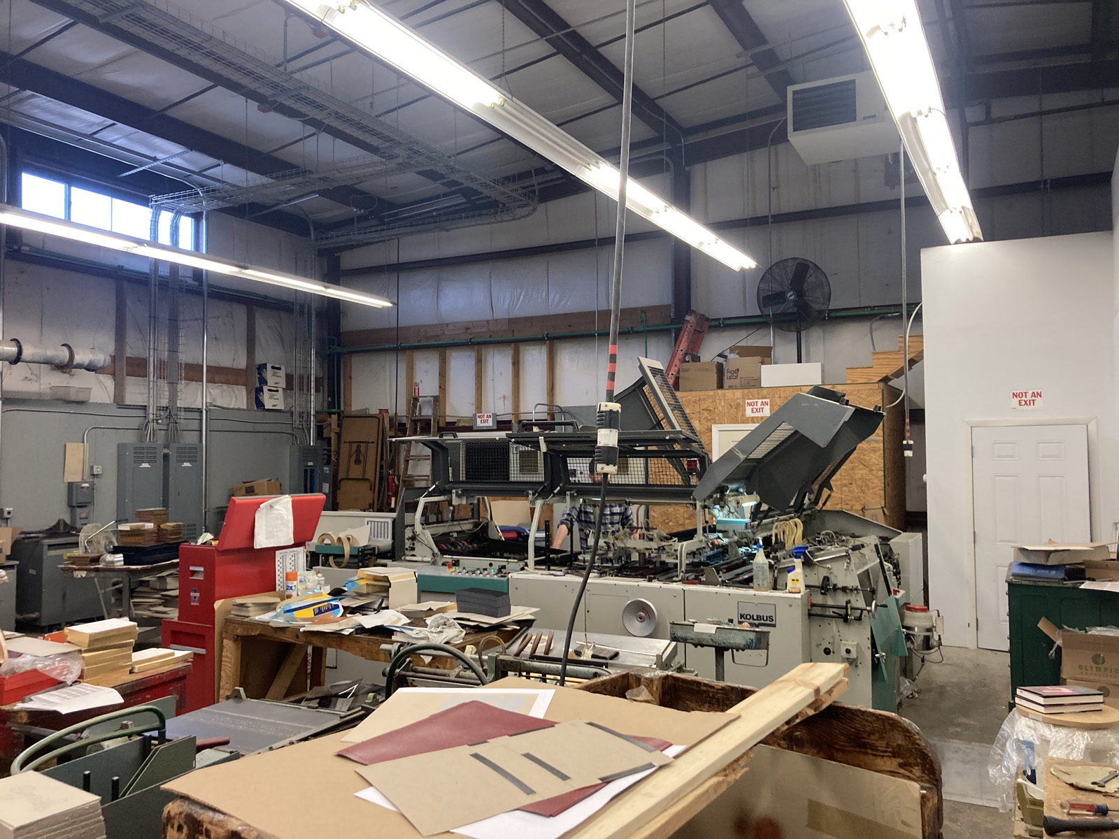 The cover of the book needed to be twice a wide as the book’s interior pages, so it could wrap around the front and back. Since risograph machines can only print as large as tabloid (11×17 in.) paper, I needed to find an offset printer to print the cover separately. Fireball Printing in Philadelphia did a great job, was easy to work with, and finished three days ahead of schedule. After receiving the covers, I delivered them and the collated pages to New Hampshire Bindery. Located in Bow, NH, they have both state of the art binding machines as well as old-fashioned tools. It’s a real vintage workshop with a down to earth approach, personal service and fair prices. Here are a few shots of their working space, a living museum of binding technology.